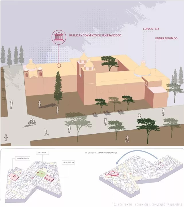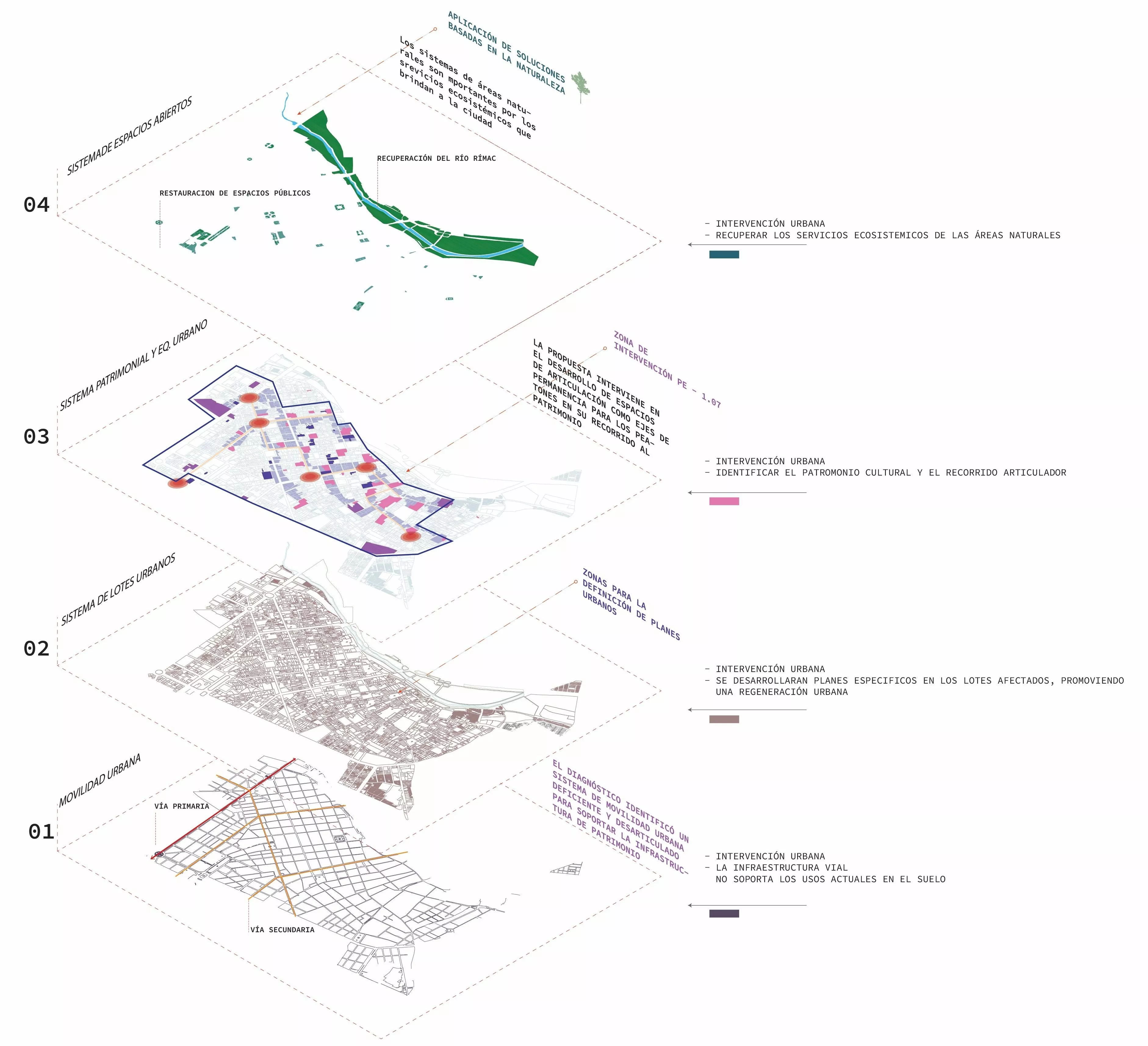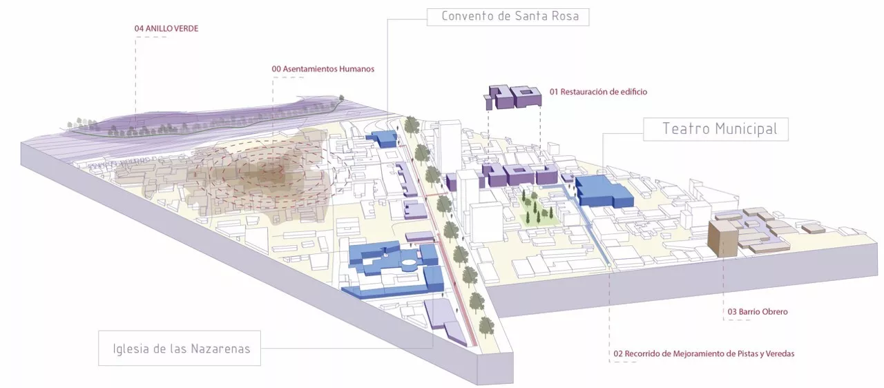 Diagramación de plantas y axonometrías como base de representación gráfica del proyecto, junto con la definición de una paleta de colores coherente que refuerza la lectura visual. Asimismo, se desarrolla la diagramación de paneles, articulando la información de manera clara, jerárquica y consistente para una adecuada comunicación del contenido.